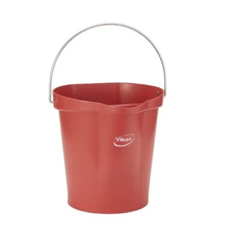 Durable 12L red polypropylene bucket with a sturdy handle for easy carrying.