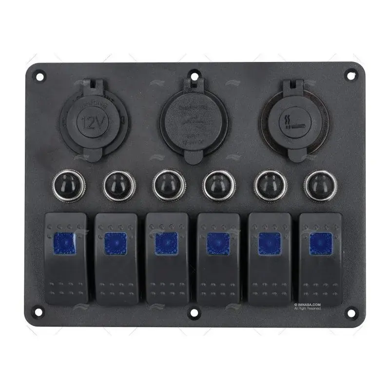 This electrical panel with 6 LED-illuminated switches allows you to easily control and monitor different electrical systems on board: bilge pumps, lights, electronics, etc. It includes USB port and auxiliary socket for charging devices or adding accessories.