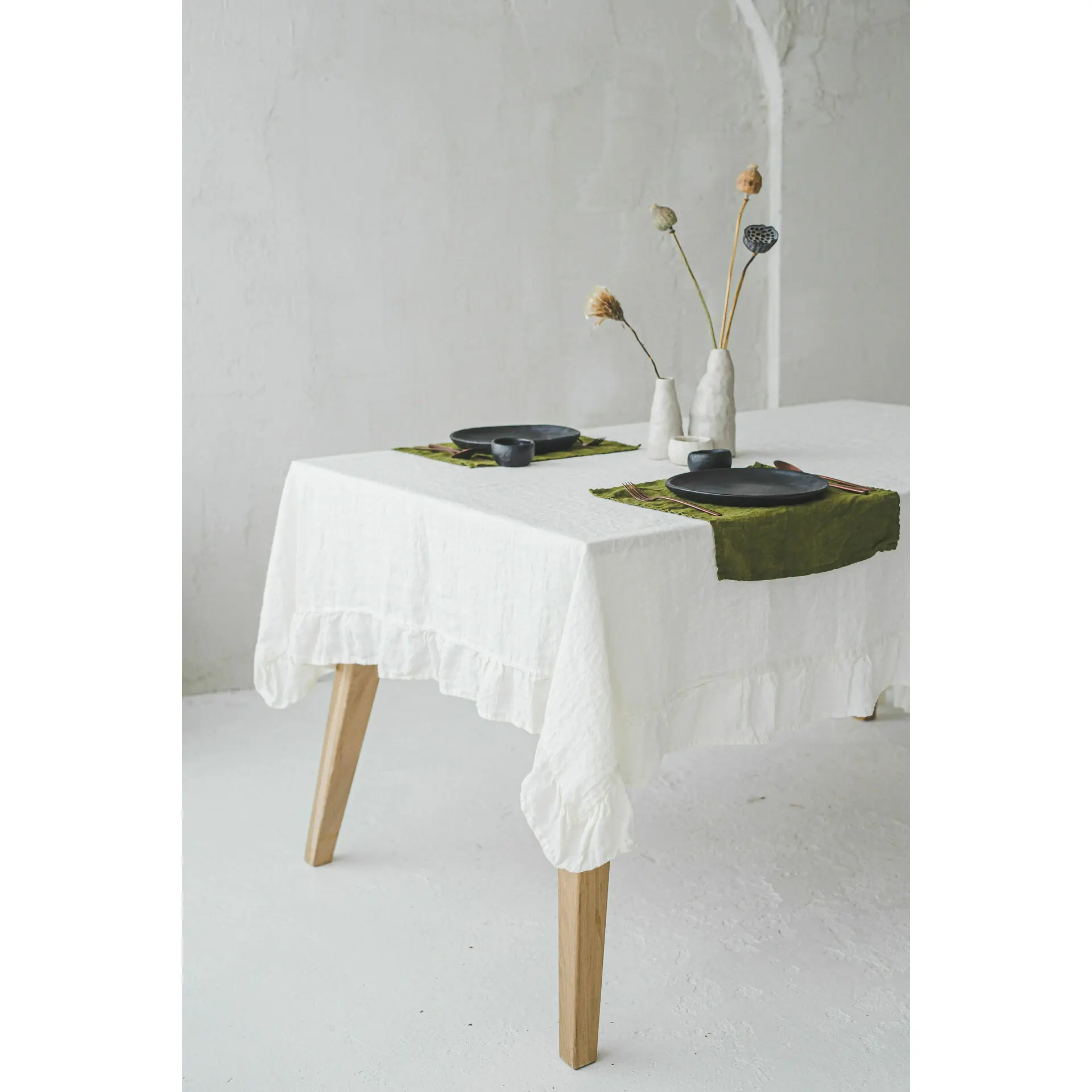 Durable linen tablecloth with ruffles, handmade in Lithuania, softens with each wash.