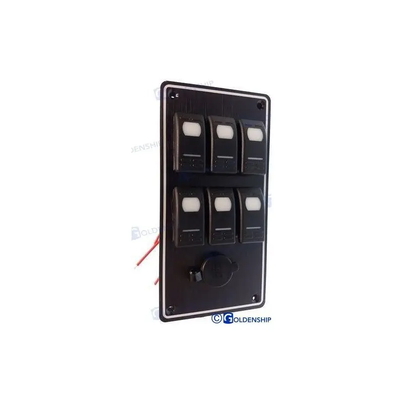 Anodised black aluminium, with 6 rocker switches and a socket for a lighter. Includes fuse box.