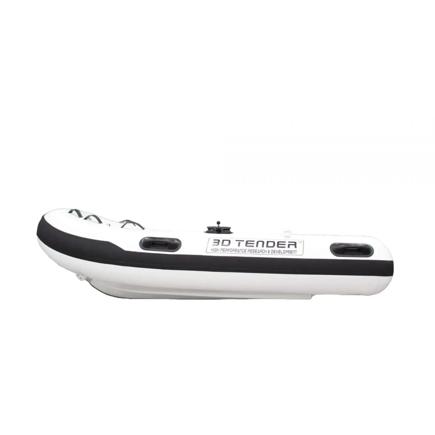 - Accessories: Standard equipment includes a front platform with a non-slip surface, fuel tank fixing straps, a pair of oars, rowing thole pins and oar locks for a double arrangement, fuel supply hose fixing attachments, a tube protection strip, non-slip deck covering, a composite bench, a storage bag under the bench, four carrying handles, four aluminium cleats, four lifting rings, four docking rings, one reinforced towing ring, a 3DTENDER aluminium plate for engine mounting, a repair kit, a pump, and a 3DTENDER accessories bag.