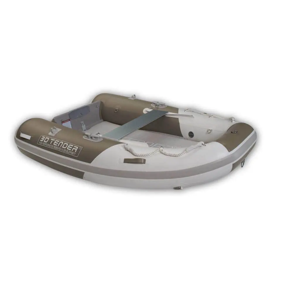 The Twin Fastcat 300 Olive/White Dinghy by 3D Tender is an innovative catamaran-style tender designed for exceptional stability and speed with low motorization. Its inflatable and foldable design ensures easy transport and storage in the included carry bag. The high-pressure Drop Stitch floor and non-slip EVA foam deck provide optimal comfort and stability. Uniquely, this dinghy is entirely self-bailing when stationary, keeping occupants dry. Constructed with high-quality PVC Valmex® fabric from Germany, it offers durability and resistance. The dinghy comes equipped with four stainless steel lifting rings, an adjustable aluminum bench, a pair of oars, an inflator, and a repair kit. Ideal for boaters seeking a practical and high-performance solution.