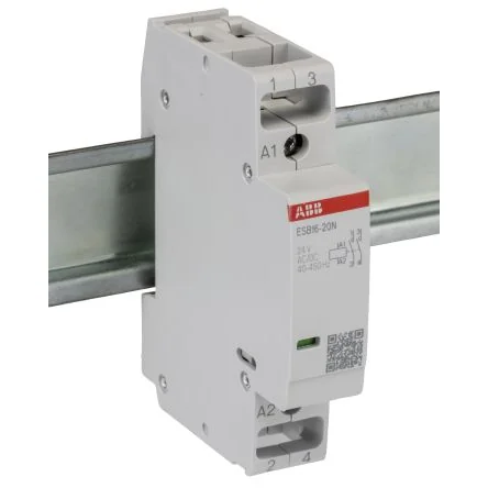The ABB ESB16 installation contactors are used to control single loads up to 16 A and can be operated by AC or DC. These contactors are made for use in household applications as well as in industrial environments. The following benefits are provided: Hum-free operation, low power consumption and integrated overvoltage protection.Rated Operational Voltage:Main Circuit 220 V DC Main Circuit 250 V AC Rated Control Circuit Voltage (Uc):24 V Rated Frequency (f):Control Circuit DC Control Circuit 50 Hz Control Circuit 60 Hz Control Circuit 400 Hz Main Circuit DC Main Circuit 50 Hz Main Circuit 60 Hz Rated Operational Current AC-1 (Ie):(NO) 16 A