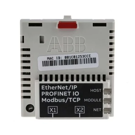 ABB AdapterThe ABB adapter is a one port Ethernet adapter module supporting PROFINET IO, EtherNet/IP and Modbus TCP communication protocols. It is compatible with ACS355, ACSM1, ACS850, ACS880 and ACS580 inverters. This selection for the protocol is done via a parameter in a drive.Features and Benefits• 20 pin connector to the drive and RJ-45 connector to Ethernet (X1 and X2) • Compact • Easy configuration • Ethernet network connection • Plastic pins, a lock and a screw hold the module in place • Three bicolour LED indicatorsApplications• Inverter drivesCertifications• EN61800-3:2004 compliance • IP20 rating