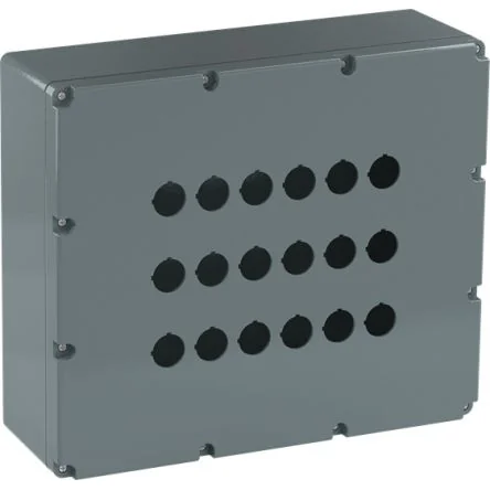 Durable grey aluminium enclosure with 18 cutouts for versatile push button applications.