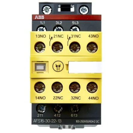 ABB Jokab AFS 3P Safety Contactor RelayThe 3-Pole ABB Jokab safety contactor relay has a coil voltage 100VAC to 250VAC at 50/60Hz and 100 to 250VDC. It has a contact current rating 28A and contact voltage rating 600VAC. It reduces panel energy consumption. It is with the front marked symbol always guarantees the right contactor status. It has yellow housing for easy identification.Features and Benefits• Built-in surge suppression • Control circuit with electronic coil interface • Dedicated 24VDC for direct control by PLC output • Front-mounted auxiliary contact block • Minimum switching capacity 12V/3mA • Mirror and mechanically linked contacts • Protective cover to prevent manual operationApplications• Controlling circuits • Machine safety applications • Monitoring circuitsCertifications• CSA certified C22.2 N°14 • EN 60947-1/60947-4-1 • IEC60947-1/60947-4-1 • UL 508