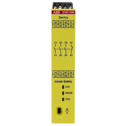 The ABB Jokab Sentry SSR10M is a dual-channel safety relay designed for reliable industrial automation.