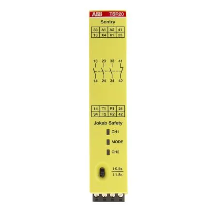 The ABB Jokab TSR20 is a reliable time delay safety relay for industrial automation, featuring dual-channel functionality.