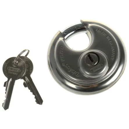 Diskus 70mm Padlock. Padlock. Stainless steel 70mm body, hardened steel shackle Special deep-weld technology for maximum strength of body Round shape hinders attack tools and allows the use of rustfree materials Hardened steel protects shackle gap, body stainless steel, inner parts all rust free Anti-cut plate, cylinder drill protected 5 pin tumbler mechanism