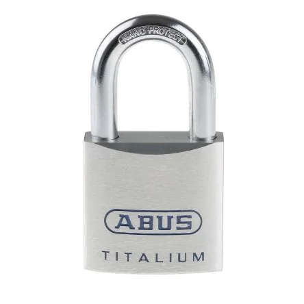 ABUS 80TI Series Titalium™ Padlocks. High quality TITALIUM™ body with stainless steel appearance: For corrosion resistance 6 Pin tumbler cylinder with anti-pick mushroom pins: Resists picking Through hardened steel alloy shackle: Resists saw attacks Rustfree internal components and chrome plated cylinder: Durable security Large tulip shaped keyhead: Convenient security Chrome plated cylinder core