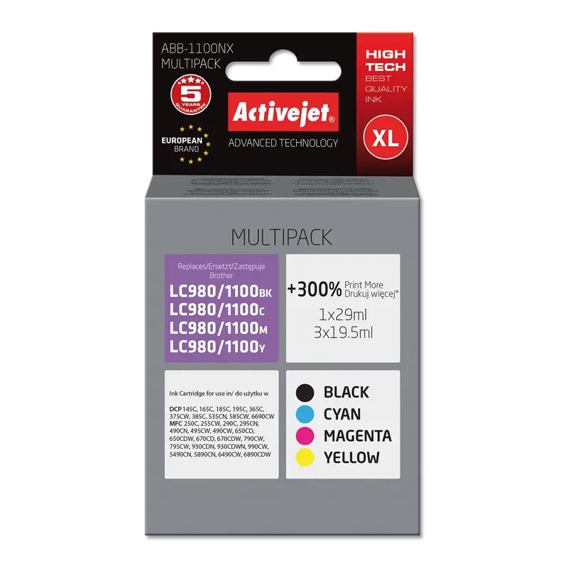 Activejet ABB-1100NX Ink (Replacement Brother LC1100/980; Supreme; 1 X 29 Ml, 3 X 19.5 Ml; Black, Red, Blue, Yellow) - ABB-1100NX