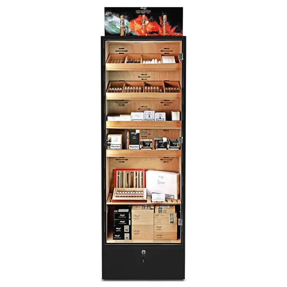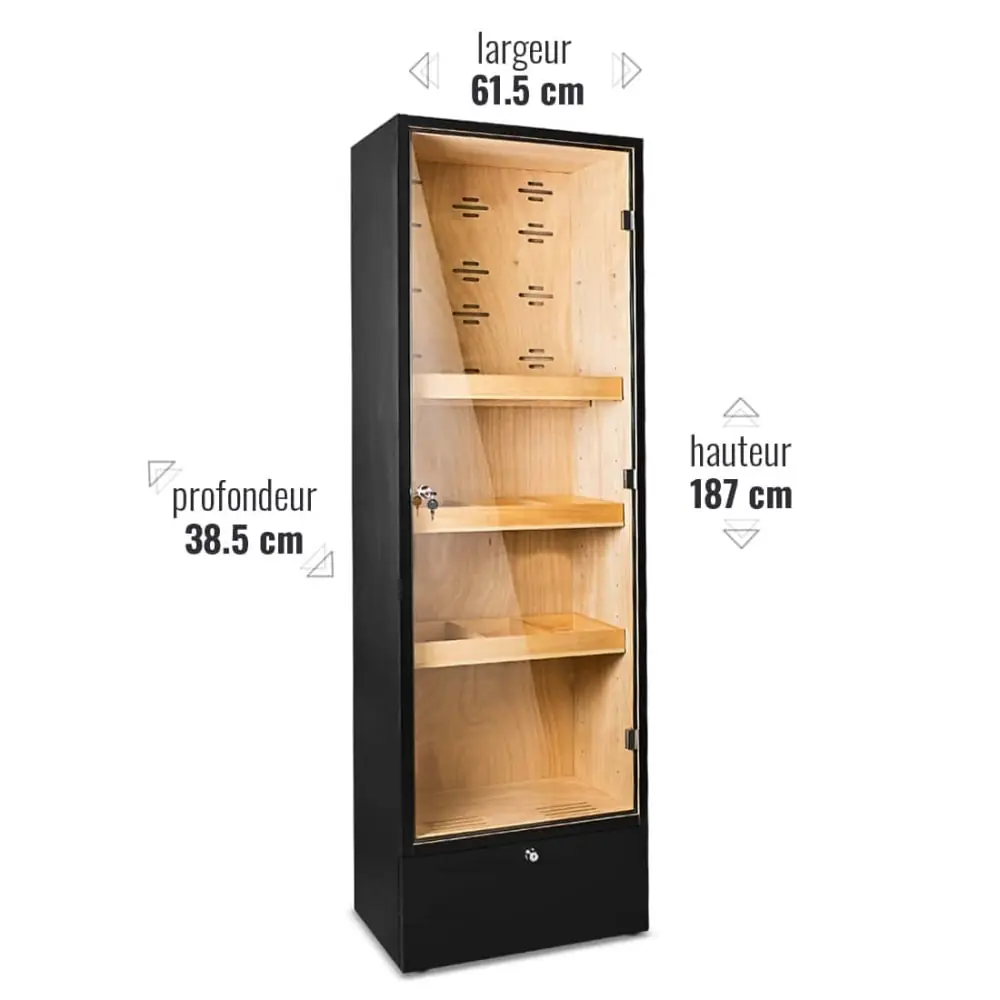 this cigar cabinet is cedar veneer with a second back panel for air circulation. it has three shelves with dividers and with magnetic edges which allows them to be transformed into a simple shelf. it will thus have four shelves in all. the humidity of the air is evenly distributed on all floors of the cigar cabinet thanks to a leveil humidifier and its four fans. finally a hidden drawer is available in the base of this large humidor.