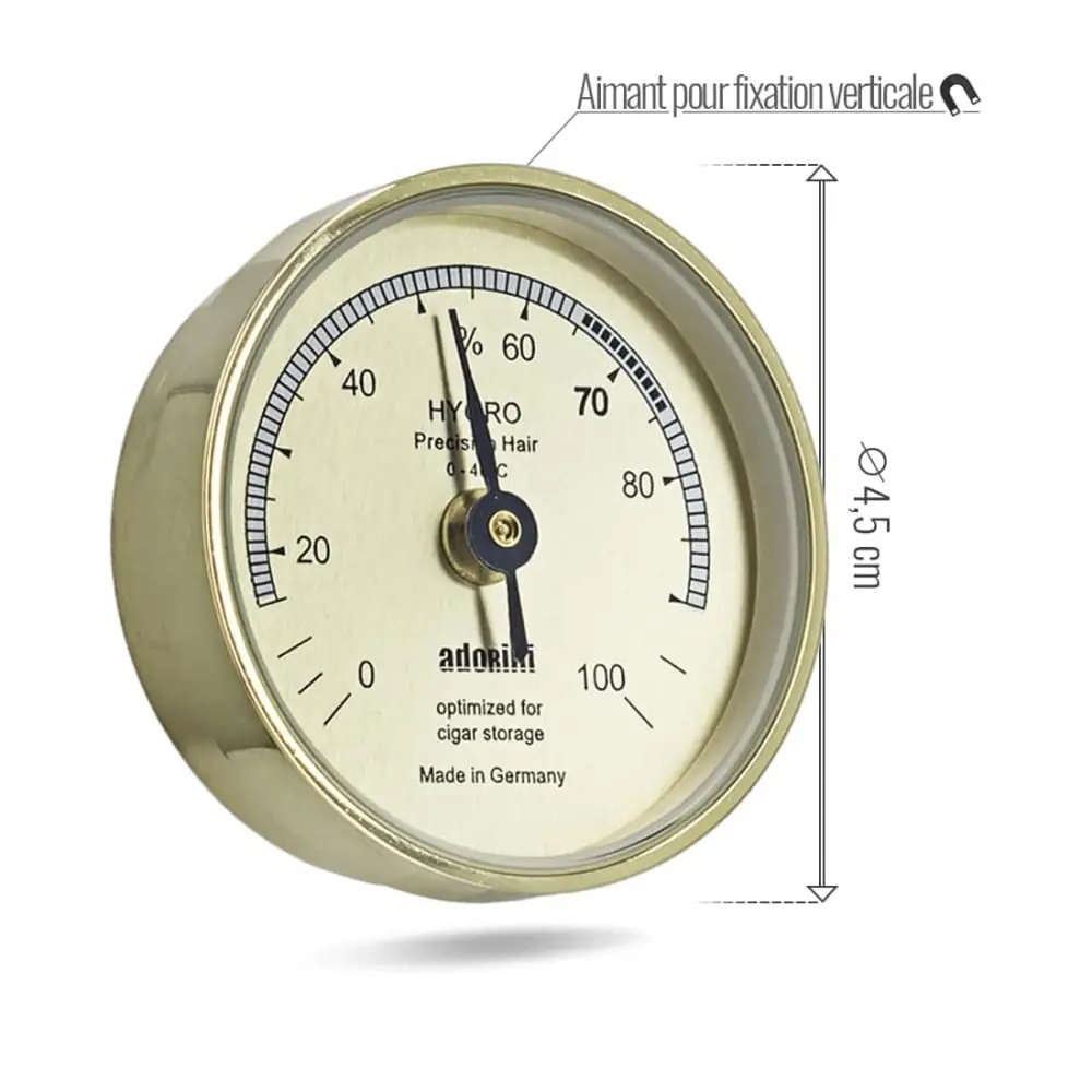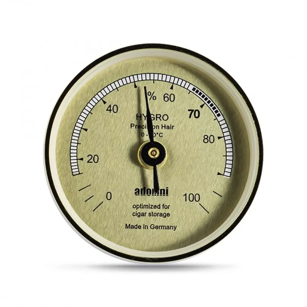 Beautiful hygrometer for humidor signed Adorini with synthetic hair. Supplied with a magnet to easily position it where you want it in the humidor. Small model.
