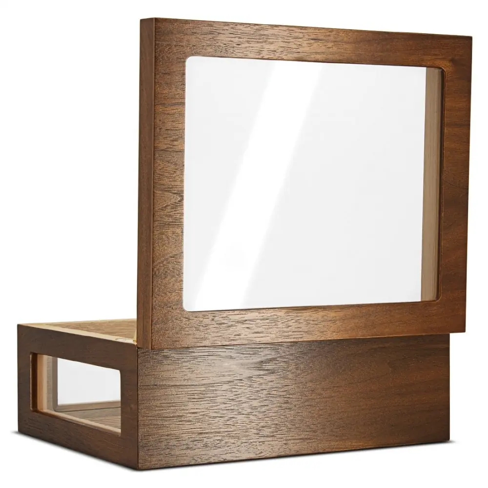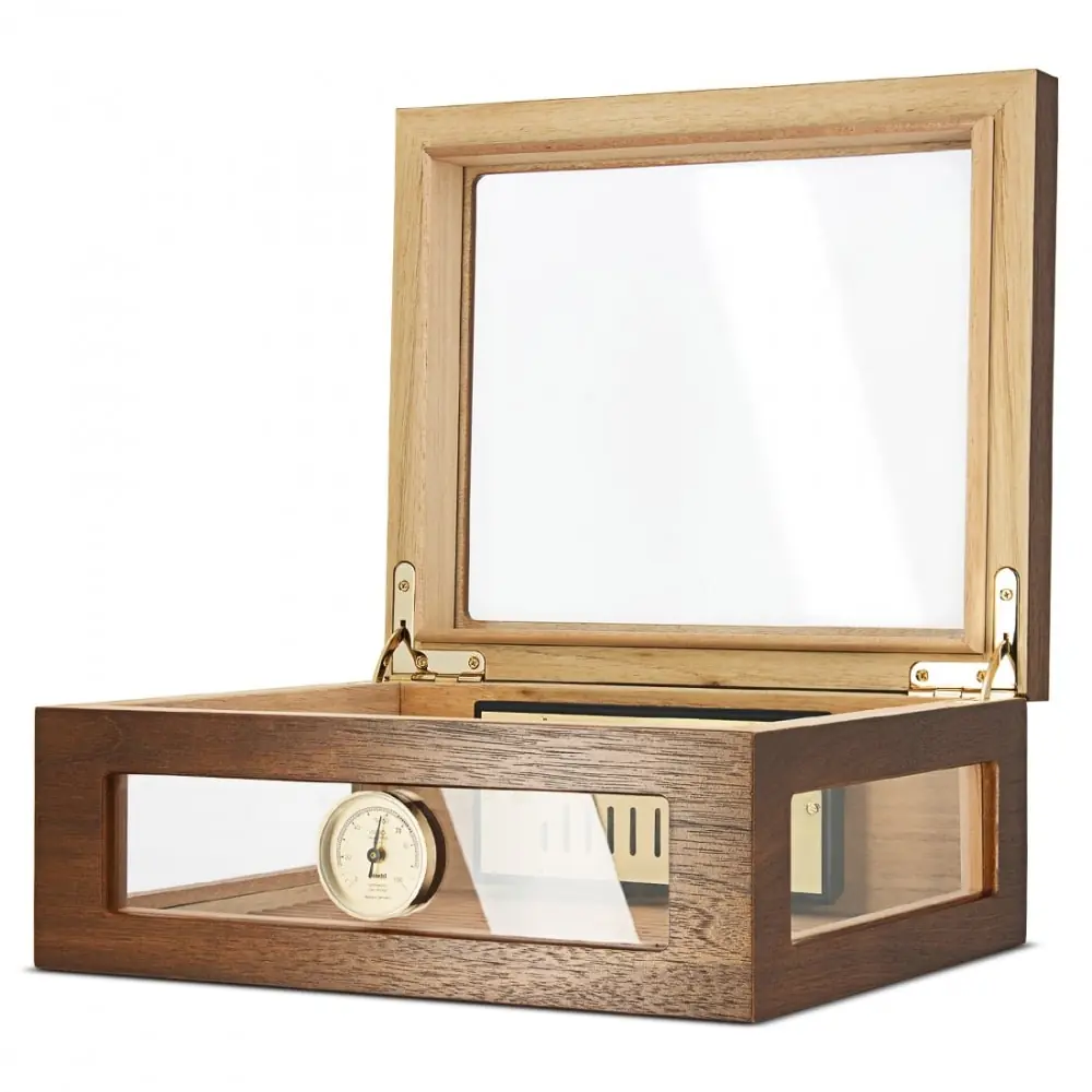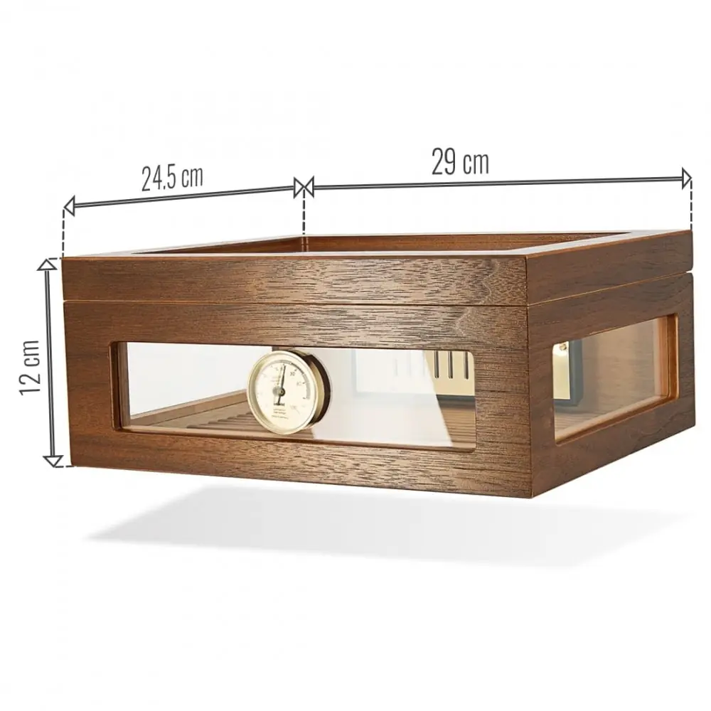 Adorini humidor in wood and glass with everything needed to protect and maintain the environment suitable for cigars. This Adorini Treviso Walnut M Deluxe humidor can hold up to approximately 75 corona type cigars. It has four parts of UV-protected glass namely the top and three of its sides which makes it possible to see the cigars without having to open the humidor. The rest of its skeleton is walnut with cedar interior. It is accompanied by a gold-plated humidifier offering constant humidity control with its acrylic polymer crystals and a needle hygrometer mounted on the front of the humidor. Its renuré bottom makes it possible to separate the cigars thanks to separators (not included) that you will find on our site. Functional and original with its glass parts, the Adorini Treviso Walnut M Deluxe cigar humidor will sit elegantly on a coffee table or in a smoking room.