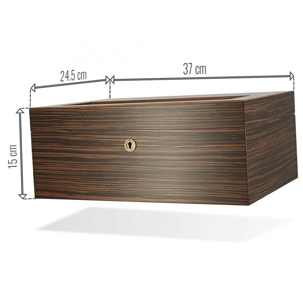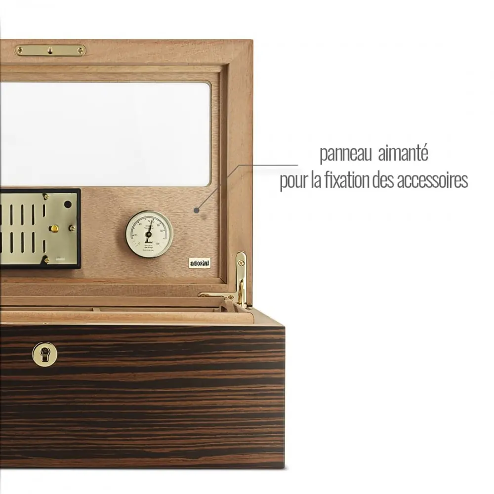Take advantage of this adorini cigar humidor purchase to best preserve and preserve your precious cigars! The adorini Vittoria Grande Deluxe cigar humidor is ideal for around 150 cigars. Its interior is made of cedar wood and its exterior is made of ebony veneer with glass glazed part. It is complemented by several accessories namely a synthetic hair hygrometer and an acrylic crystal humidifier. It is possible to easily separate and sort the many modules thanks to its removable tray, its three vertical separators, its three horizontal separators, and its four clips on which you can write the name and origin of the modules. Finally, the cigar cellar will be perfectly secure thanks to its lock and its set of two keys.