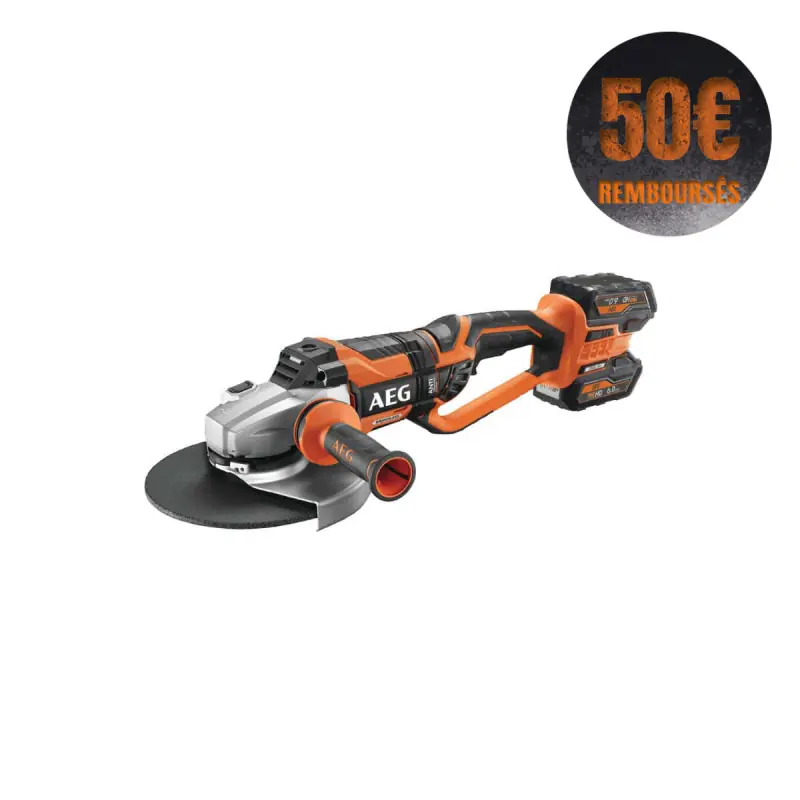 AEG 18V Grinder - Brushless - Dual - 230mm - 2 Batteries 6.0Ah - 1 Charger - BEWS 18-230BL-602 This grinder features a disc diameter of 230mm. Its dual battery system allows for better autonomy.