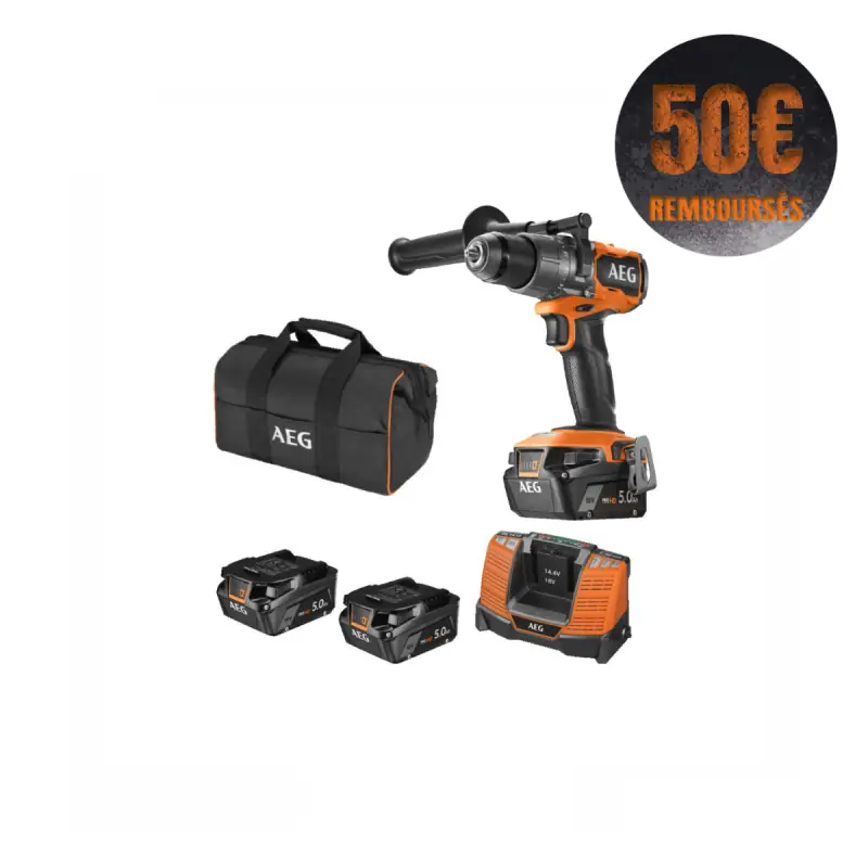 The AEG 18V Brushless Hammer Drill - 2 batteries 5.0Ah - 1 charger - Additional handle - BSB18C3BL-502C is the ideal tool for your drilling tasks in most materials thanks to its brushless technology and high torque. You will also benefit from a real time-saving via the reliable metal keyless chuck with its lock that facilitates replacement and ensures a secure attachment of the equipment.