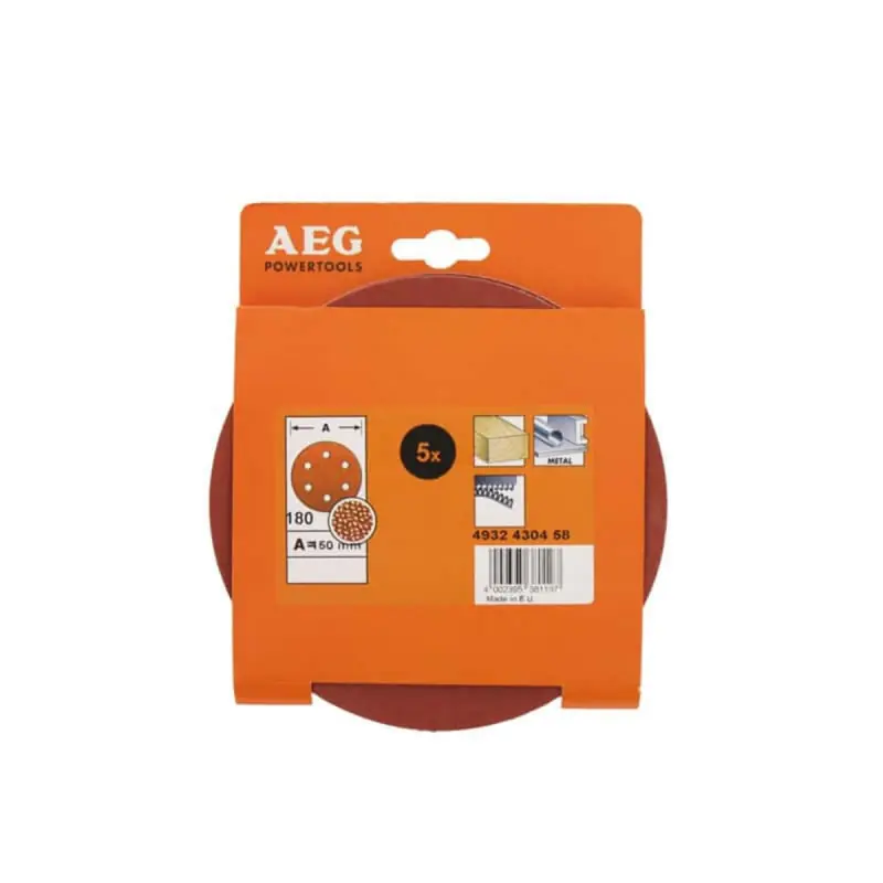 Kit of 5 AEG abrasive discs grit 180 150mm 4932430458 self-adhesive, these discs are designed for use on wood and metals.