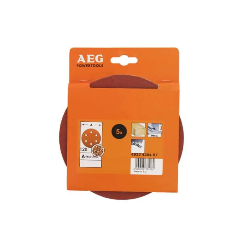 Kit of 5 AEG abrasive discs grit 40 150mm 4932430454 designed for use on wood and metals, these discs are self-adhesive.