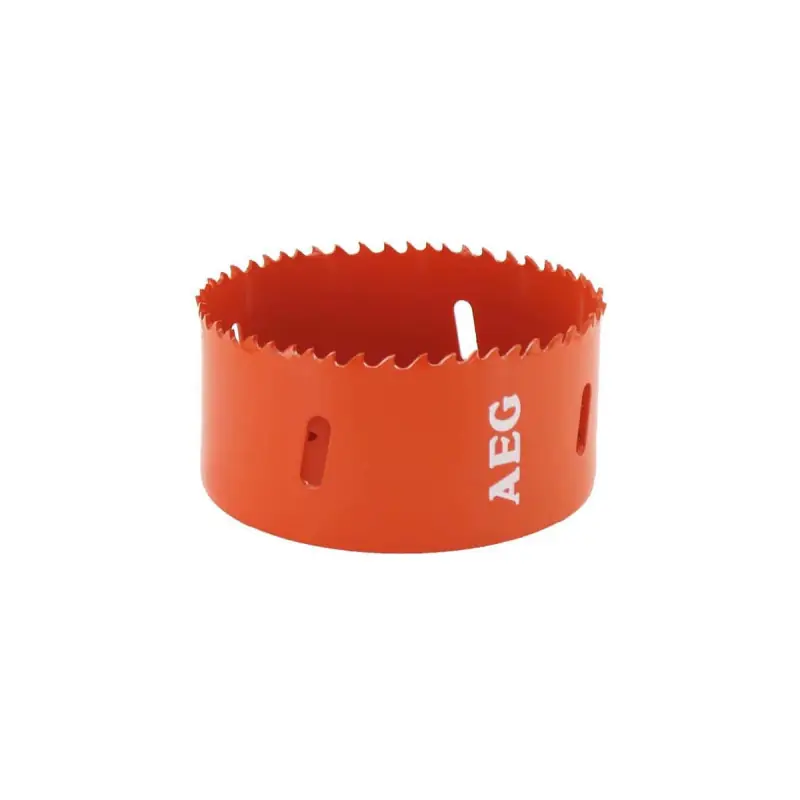 Durable AEG bi-metal hole saw for efficient cutting of metal and wood.