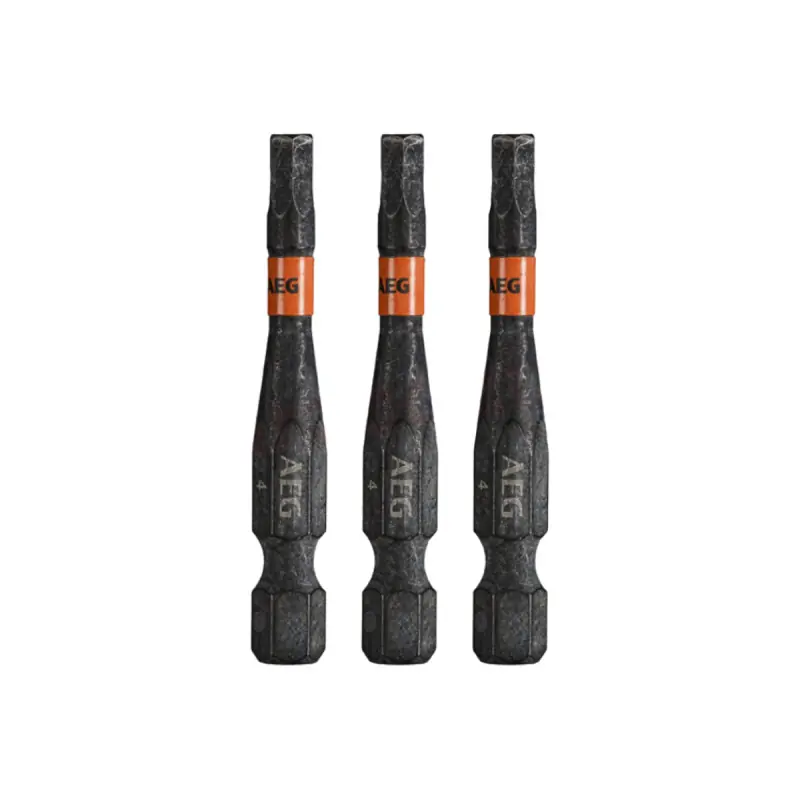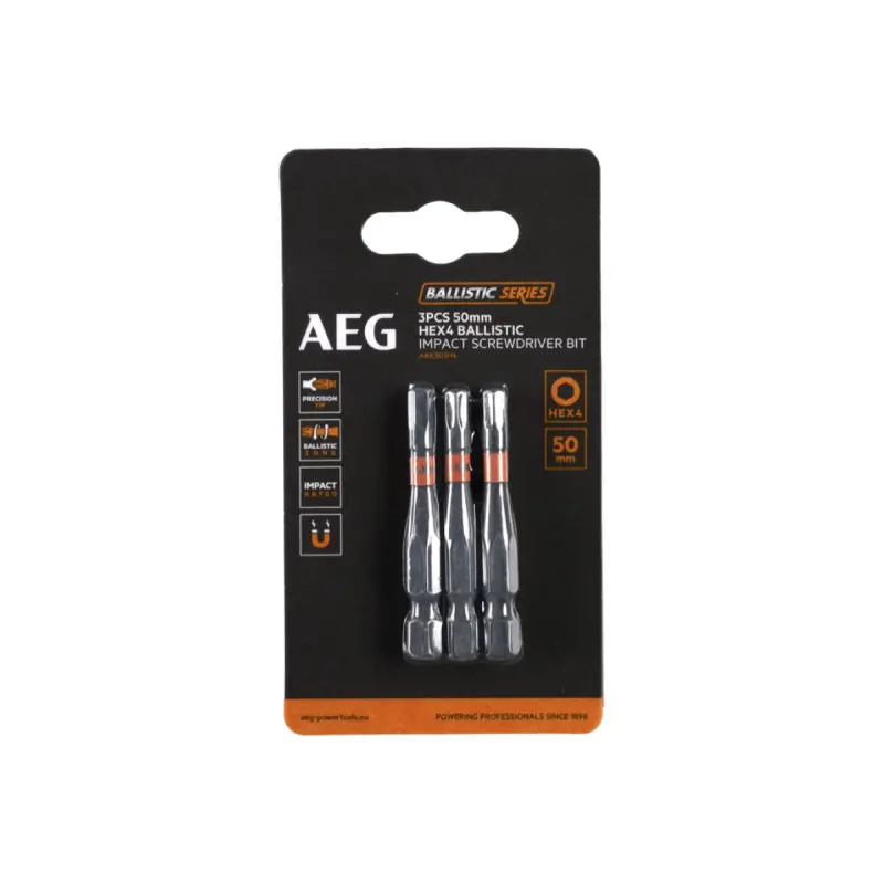 Reinforced ballistic screwdriver bits AEG - 50 mm - 3 pcs - HEX4 designed to work with impact during the assembly and disassembly of fasteners. Due to the high torque twisting zone, the force transmission is reduced, resulting in a long service life.