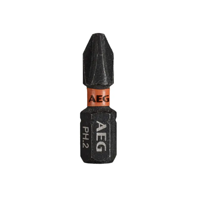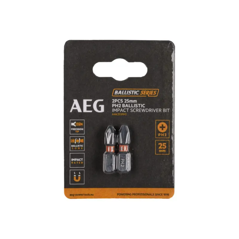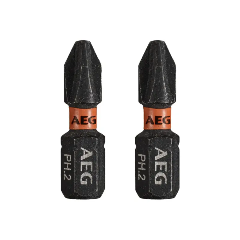 Reinforced ballistic screwdriver bits AEG - 25 mm - 2 pcs - PH2 designed to work with impact during the assembly and disassembly of fasteners. Due to the high torque twisting zone, the force transmission is reduced, resulting in a long service life.