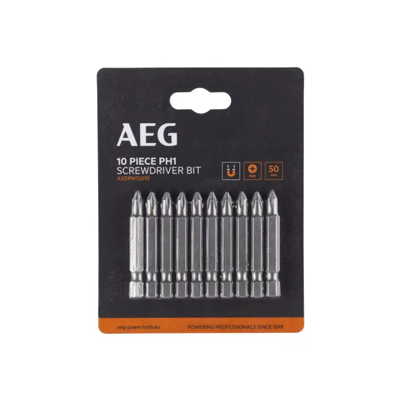 These AEG screwdriver bits - 50 mm - Steel - 10 pcs - PH1 are designed for all your screwing tasks. Their universal format allows for use with electric tools from different brands, proving their versatility. The bits are made from high-quality steel, ensuring a long lifespan.