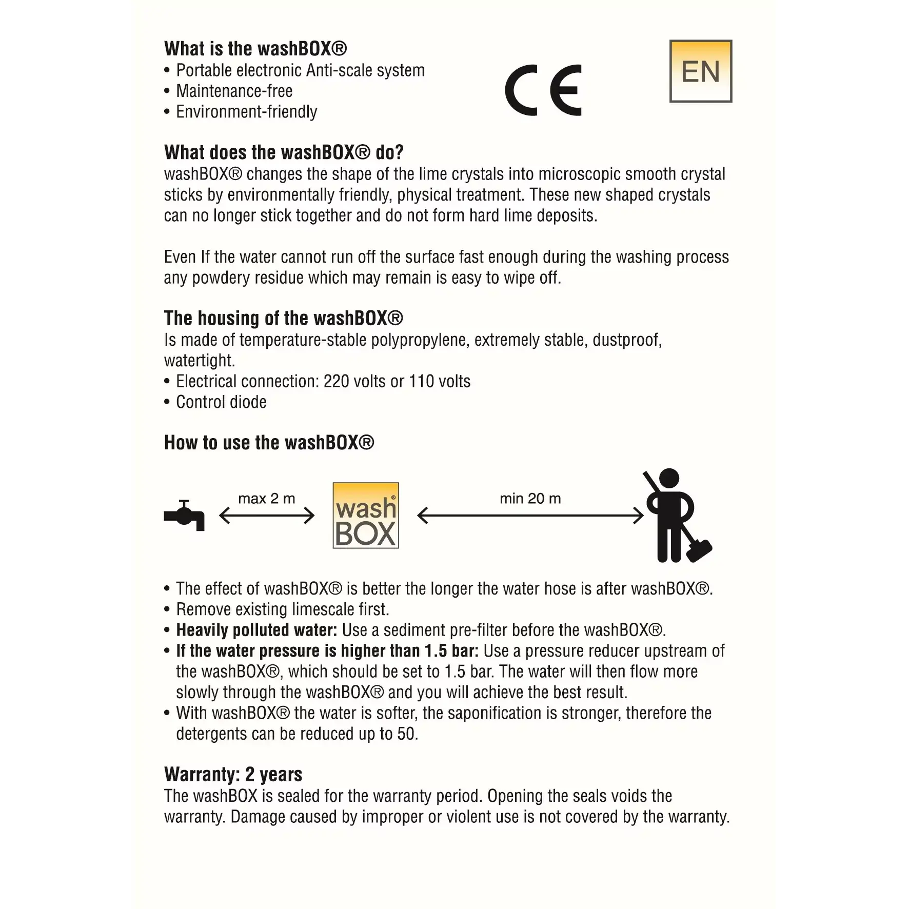 Portable Anti - scale System WashBOX®1/2” 24 Volts, capacity 1500L/h, salt and chemical free, maintenance - free, extremely stable, waterproof, colour: Yellow. We recommend you add the Pressure Regulator for optimum results.
