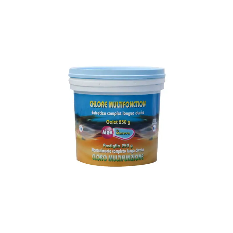 ThisAïga MAREVA Chlorine Cleaning Packis the winning combination for a healthy and hygienic pool all summer long. Indeed, one does not go without the other. You need a regular maintenance product and another more powerful shock treatment to be added occasionally, even if your water looks beautiful. In fact, the shock treatment is essential to keep it healthy. The multifunctional Chlorine will effectively disinfect your water consistently at a rate of once a week. Itis a powerful disinfectant against all kinds of bacteria, germs, or algae, but it is also versatile: it optimises filtration while being a clarifier and a brightener. Ideal for a complete in-depth action and regular comprehensive maintenance of your pool.The quick Chlorine is a shock treatment with powerful disinfecting action to be added once a month. This type of treatment, more powerful than regular treatments, should be done once a month to combat the habituation effect of bacteria to slow chlorine.The 250 g multifunctional Chlorine tablets are sufficient for 20 to 30 m³ of water and can be placed directly in the skimmer or the diffuser; the quick chlorine, on the other hand, comes in granule form.This combination will be idealfor eliminating all bacteria, algae, impurities, and other microorganisms present in the water. The combination of regular maintenance with an occasional shock treatment is the key to keeping your pool healthy and clear all summer long.