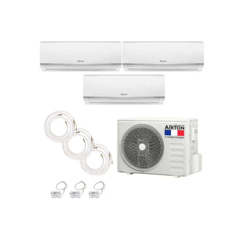 The AIRTON reversible bi-split air conditioning pack - DIY Installation allows you to install three indoor air conditioners on a single system. You can choose which rooms you want to place your units in, and they can be managed individually for complete control over the temperature. The 3500 W unit is more suitable for a large room like a living room. The 2500 W units will be more appropriate for bedrooms, for example. This way, you can enjoy warm or cold air all year round. Additionally, these devices have been designed to be environmentally friendly. This pack also includes three refrigerant connections for a complete installation, as well as three Wi-Fi module kits that allow you to control the air conditioners using your smartphone or tablet. Simply download the " » application available in the App Store and Google Play Store, and you're all set.
