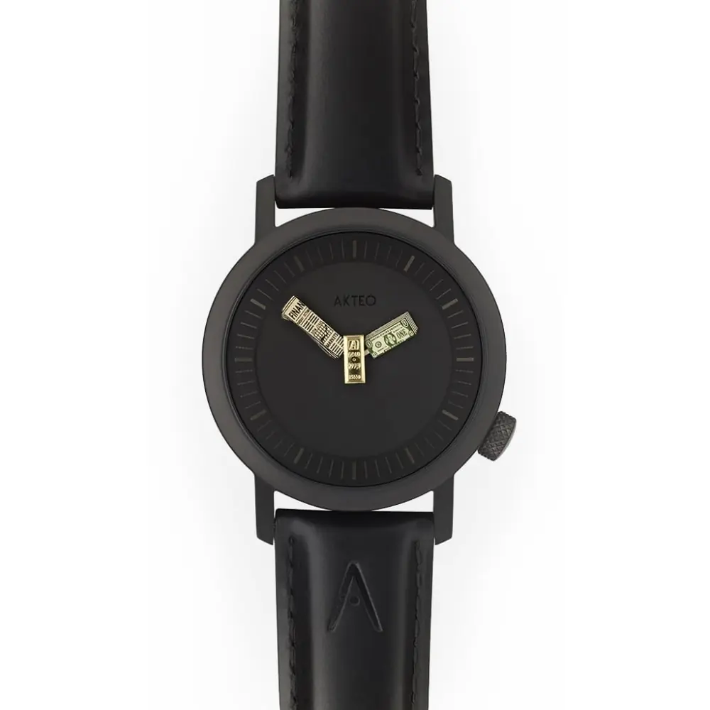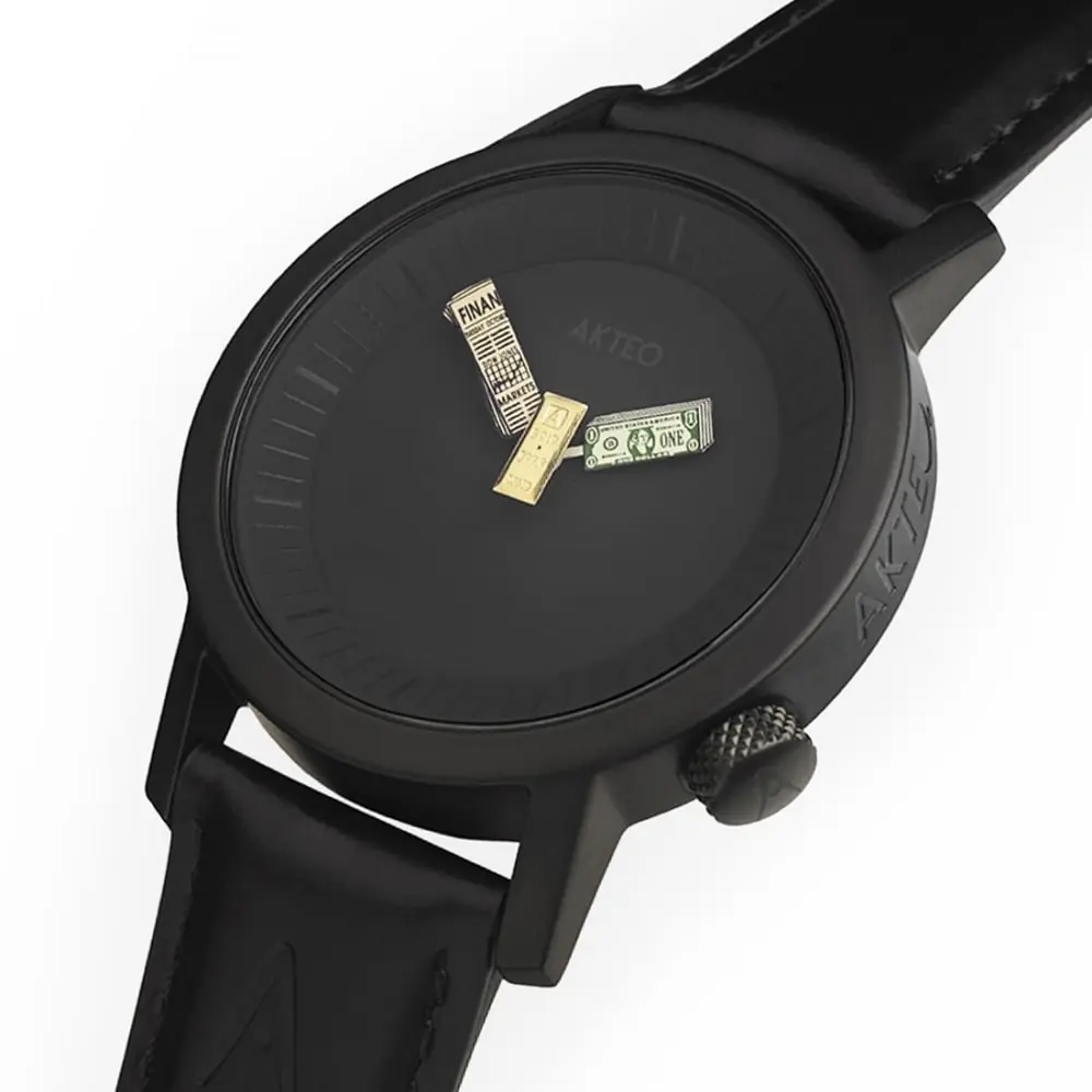 Watch whose hands represent a dollar a "financial time" type newspaper and a gold ingot with an all black finish.