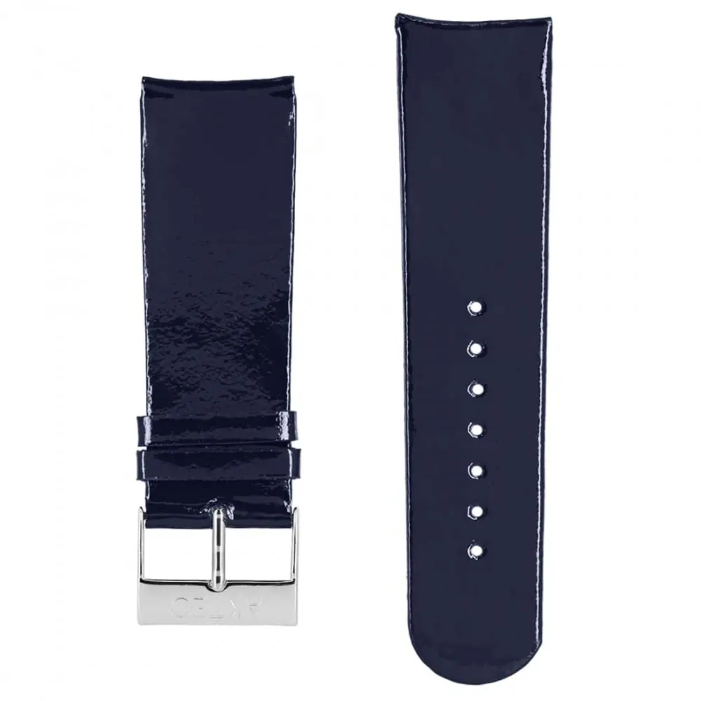 flat dark blue patent leather strap designed specifically for akteo watches. 25 mm wide with silver buckle.