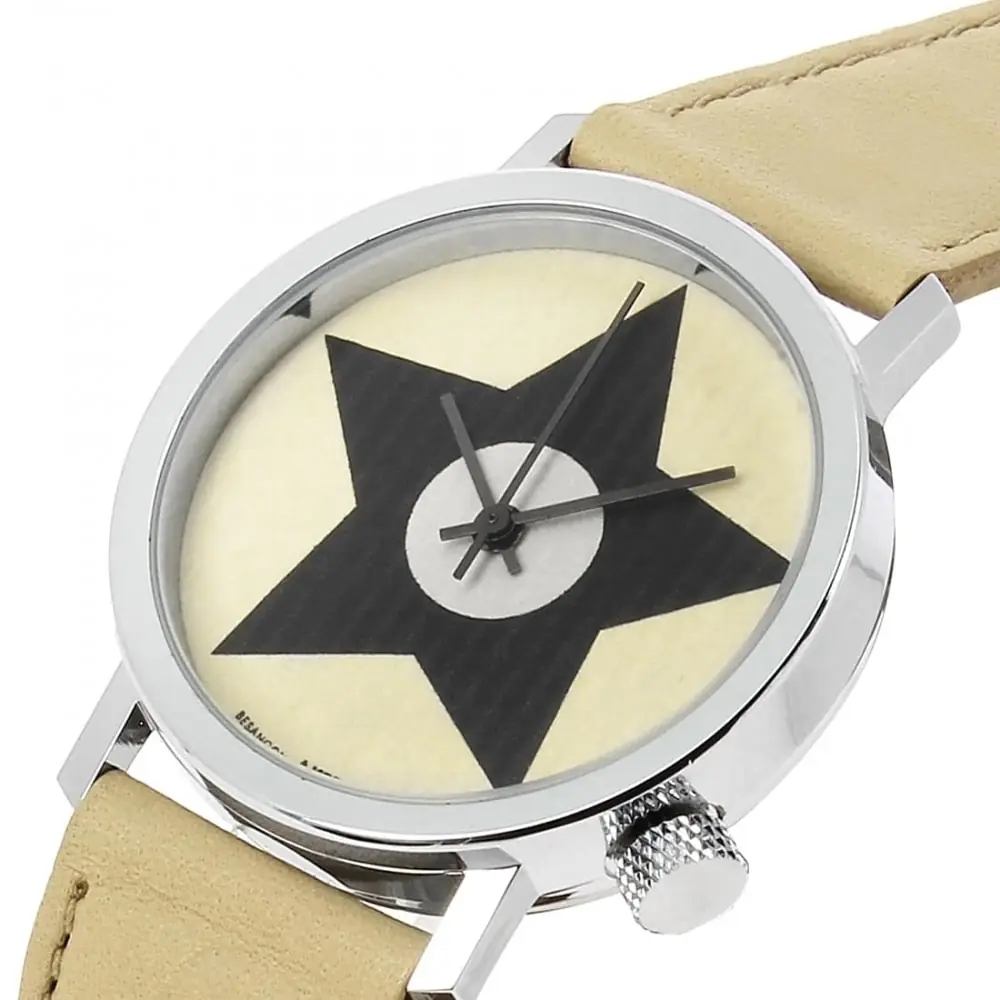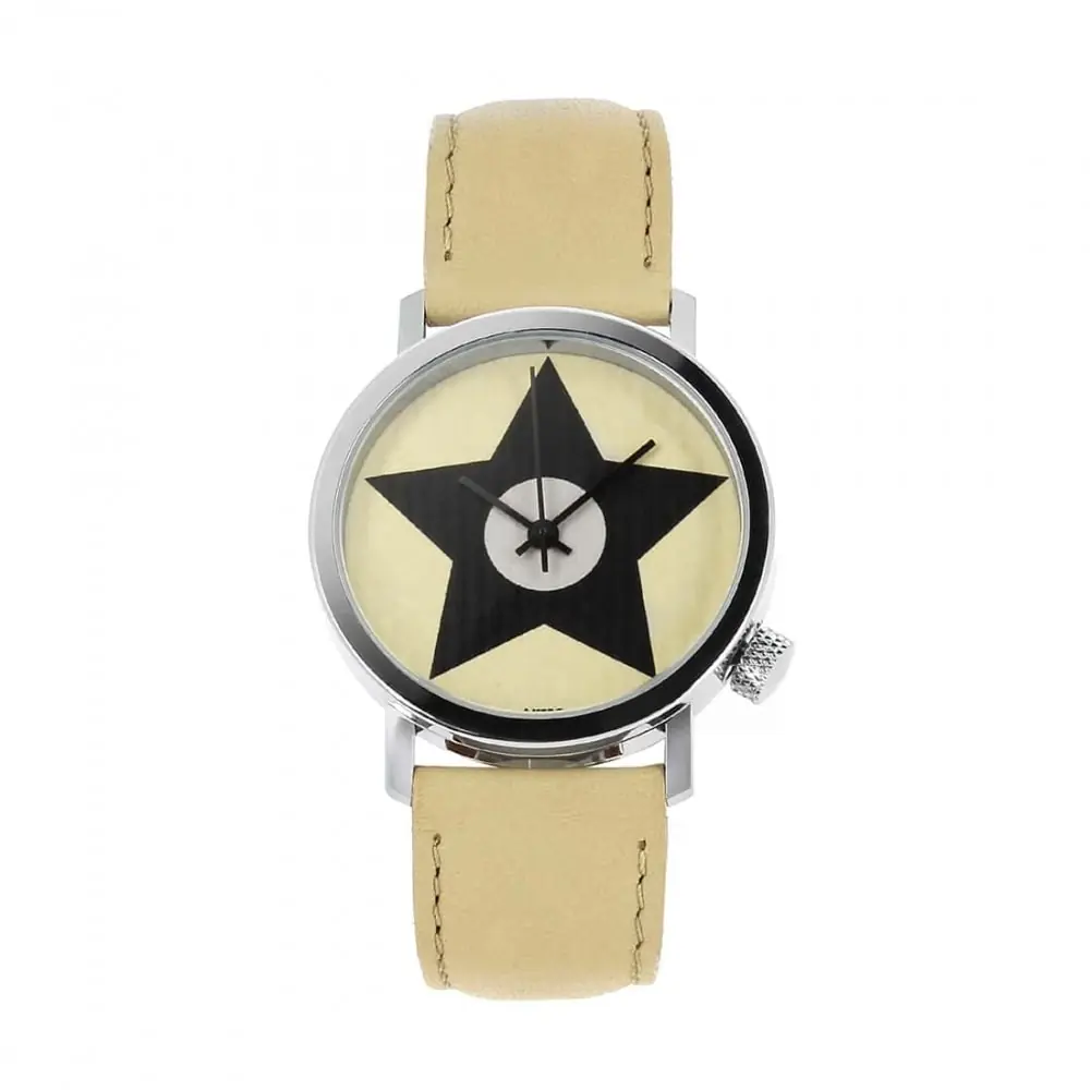 beige leather strap chrome dial and black star on the bottom of the dial. with this watch on your wrist you will add a touch of distinction to your outfit.