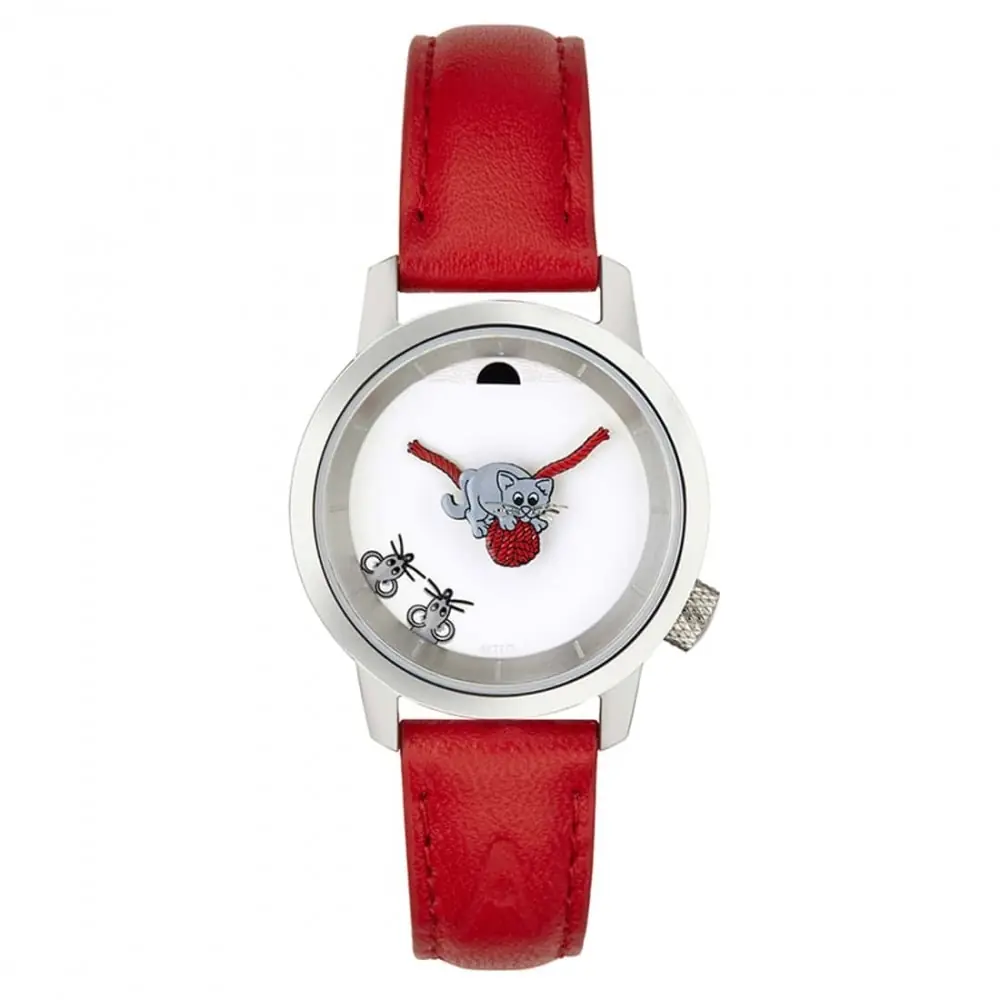 The Akteo Chaton W29 watch is a model dedicated to cat lovers. Its playful dial features a cat and the ends of a ball of wool for the hour and minute hands and it is equipped with a stainless steel case and a red leather strap.