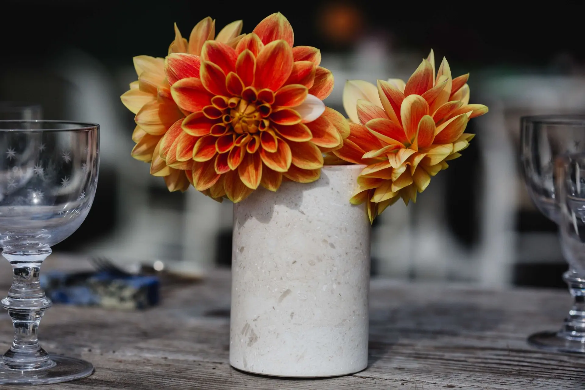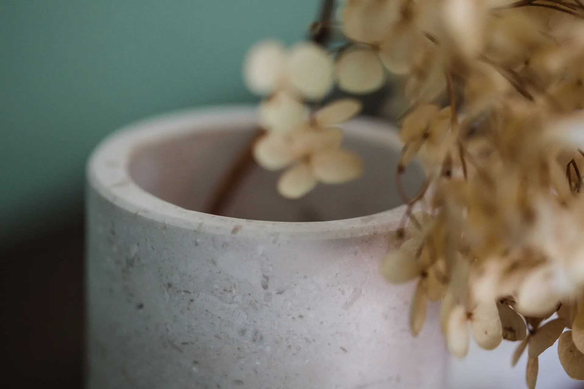 Albaperla marble glass is a unique decorative holder for flowers, toothbrushes, or pens, showcasing its fossil-rich personality.