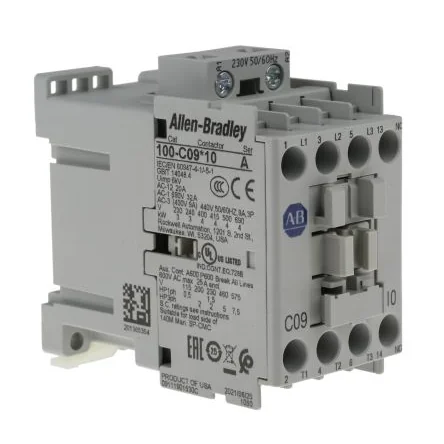 Allen Bradley 100-C AC Coil Operating Contactors. Experience greater efficiency, reliability, and enhanced performance with the compact yet powerful 100-C series of contactors by Allen Bradley. These space-saving IEC contactors offer high switching power, ensuring application versatility and the ability to handle the high starting currents of modern motors and other loads. They have low power consumption and offer high connection reliability and ease-of-wiring due to having two separate power connections per pole, saving you valuable time and money. They are made of environmentally friendly materials and are RoHs compliant for added peace-of-mind. 100-C series contactors have reversible coil terminals, offer front and side mounting of auxiliary contacts, and can be attached to a 35mm DIN Rail mount or panel mounted. Breadth of line is 9..97 A. These contactors provide IP2X finger protection to prevent risk of injury to operators and risk of damage to the device. They are compatible with electronic overload relays and bimetallic relays. This series also conveniently offers common accessories for all contactor sizes to give you a perfectly integrated system. Features:. Max Switching Voltage 690V (Rated Voltage) AC3 Coil Nominal AC Power 8 to 16 VA (Hold in); 70 to 200VA (Inrush) Electrical Life: 1.3 Million Operations (400V) 3 pole, 1 NO auxiliary contact on sizes 4 to 11kW. Standards: IEC947, EN60 947, VDE0660, UL508, CSA22.2. Approvals: UL, CSA