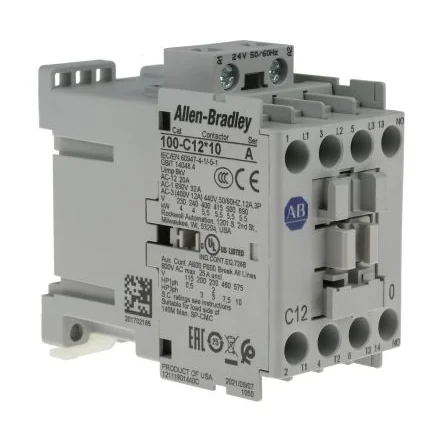 Allen Bradley 100-C AC Coil Operating Contactors. Experience greater efficiency, reliability, and enhanced performance with the compact yet powerful 100-C series of contactors by Allen Bradley. These space-saving IEC contactors offer high switching power, ensuring application versatility and the ability to handle the high starting currents of modern motors and other loads. They have low power consumption and offer high connection reliability and ease-of-wiring due to having two separate power connections per pole, saving you valuable time and money. They are made of environmentally friendly materials and are RoHs compliant for added peace-of-mind. 100-C series contactors have reversible coil terminals, offer front and side mounting of auxiliary contacts, and can be attached to a 35mm DIN Rail mount or panel mounted. Breadth of line is 9..97 A. These contactors provide IP2X finger protection to prevent risk of injury to operators and risk of damage to the device. They are compatible with electronic overload relays and bimetallic relays. This series also conveniently offers common accessories for all contactor sizes to give you a perfectly integrated system. Features:. Max Switching Voltage 690V (Rated Voltage) AC3 Coil Nominal AC Power 8 to 16 VA (Hold in); 70 to 200VA (Inrush) Electrical Life: 1.3 Million Operations (400V) 3 pole, 1 NO auxiliary contact on sizes 4 to 11kW. Standards: IEC947, EN60 947, VDE0660, UL508, CSA22.2. Approvals: UL, CSA