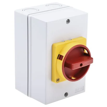 Allen Bradley Enclosed Switch Disconnectors. These disconnectors feature durable ABS thermoplastic enclosures. The cover is interlocked to prevent removal when live, reducing risk of electric shock. The handle can be padlocked in up to three positions in the OFF position for greater protection and security. They also have an earth connection in the base of the enclosure. Standards: IEC 947, VDE 0660. Approvals: UL, CSA