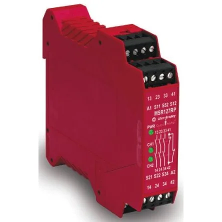 Rockwell Automation 440R Minotaur MSR127RTP Safety Relay, Single Channel. For dependable fault detection that will minimise downtime and help you keep operations running efficiently, the 440R Minotaur MSR127RTP Single Function Safety Relays by Rockwell Automation are the ideal choice for your safety control system. The MSR family of relays are perfectly suited for relatively small safety applications and single zone control. These versatile single function safety relays can be connected in 3 different input wiring configurations: 1NC, 2NC, or with two PNP connections from a light curtain. The MSR127RT checks for cross faults across the two inputs when connected in the 2NC configuration. The light curtain must perform the cross fault detection when the safety relay is connected to light curtains. The MSR127TP relay features an automatic/manual reset, which can be jumpered or changed to an unmonitored manual reset by the addition of a normally open switch in the monitoring loop. The MSR127RP unit has a monitored manual reset which offers checking of the output monitoring circuit. These devices are ideal for light curtain, E-stop or safety gate applications. Features and Benefits:. Compact housing Stop category 0 and Cross fault monitoring Cat. 4 per EN954-1 Relays with monitored or automatic reset Removable terminals Three NO (Normally Open) safety-rated outputs, one NC (Normally Closed) auxiliary contact Safety outputs feature independent and redundant internal contacts to support the safety function Auxiliary output is a non-safety output which can provide an external signal to indicate the status of the safety outputs. Standards:. EN 954-1, ISO 13849-1, IEC/EN 60204-1, IEC 60947-4-1, IEC 60947-5-1, ANSI B11.19, AS4024.1.