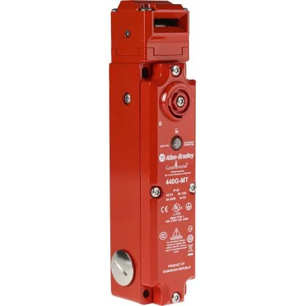Allen Bradley Guardmaster 440G-MT47013 Solenoid Interlock SwitchThe 440G-MT47013 Solenoid Interlock Switch by Allen Bradley Guardmaster provides secure guard-locking and improves protection for machine operators in hazardous areas. The 440G-MT family are dependable heavy-duty safety switches which are best suited for use with machinery which does not immediately stop when the power supply is removed, or which could be damaged by interference while in motion. The 440G-MT is a positive mode, tongue operated safety interlock switch. It works by keeping the guard securely locked until a signal is applied to the internal solenoid. This will then release the lock mechanism and allow the safety barrier to open. It will prevent power running to the machine while the barrier is open, so that personnel cannot physically access the area while machinery is in motion. This helps to decrease risk of injury to machine operators and reduce downtime.The 440G-MT47013 guard-locking switch is Power-To Release. It has 3NC safety contacts, 1 NO auxiliary contact. The housing material is made of die-cast painted zinc alloy, offering superior durability. Due to this, the switch can be used in harsh environments. The holding force is 1500N (337 lbs), ensuring greater stability of the safety guard. It has a solenoid voltage of 110V ac/dc and the solenoid power is 13W typical 100% ED. This unit comes with M20 conduit entry. It also has Break-Before-Make action. This versatile safety switch is sealed to IP67 and is highly suitable for use in wet environments. It is fully protected against ingress of dust particles and can withstand temporary immersion in water. It has a minimum operating radius of 60mm.Features and Benefits:• Ideally suited for use in harsh environments such as industrial settings due to heavy-duty die-cast painted zinc alloy housing • Environmentally sealed to IP67, allowing use in environments with regular washdowns • Reliable high locking force of 1500N (337 lbs) • Embedded LED provides clear visual indication of the status of the switch: ’door open’, ’door shut and unlocked’, and ’door shut and locked’Certifications:IP67 rated EN954-1 ISO13849-1 IEC/EN60204-1 NFPA79 EN1088 ISO14119 IEC/EN60947-5-1 ANSI B11.19 AS4024 CE certified cULus approved CSA certified TUV certifiedHow do Solenoid Interlock Switches work?Solenoid interlock switches work by having their internal solenoid energised (Power to Release) or de-energised (Power to Lock) by an external signal. The solenoid is a wire coil which converts electrical energy into mechanical energy. These types of safety switches are often used in industrial environments on machine guards to monitor the barrier status and limit unsafe access to hazardous equipment. They ensure that safety barriers remain securely locked while dangerous processes are running. They are useful with machinery that does not instantly stop, such as high inertia rotating machines.Rockwell Automation is a global leader in industrial automation and digital transformation, and brings smart manufacturing to life. With a long legacy of creating Allen-Bradley® integrated control and information solutions, we help make you as productive as possible. Our portfolio of sensing, safety and motor control products can support your move towards smart machine applications. Allen-Bradley® IO-Link sensors are data-enabled and communicate with all field buses, providing diagnostic and health information about the device before a machine stops, and enabling quick production changeovers through fast parameter downloads from PLCs into the device. This reduces machine downtime and increases manufacturing OEE. For safety components, products with built-in diagnostics simplify the set-up of the smart device, and reduce maintenance, leading to a more efficient, machine data-driven approach.