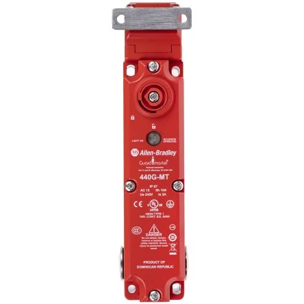 Allen Bradley Guardmaster 440G-MT47037 Solenoid Safety Interlock Switch, Power to UnlockEnsure affordable and reliable safe-access to machinery for personnel with the 440G-MT47037 safety interlock. This switch can be used on equipment safety barriers to keep them securely locked while in operation, and to keep power isolated while the guard is released. This reduces risk of injury to operators by preventing access to dangerous areas where machinery may be in motion.This guard locking switch has Break-Before-Make action, Power-to-Release functionality, and 3NC/1NO contacts. The supply voltage rating is 24VAC/DC and it has M20 conduit entry. Thermal current is 10A. The 440G-MT Switches by Allen Bradley Guardmaster are heavy duty solenoid safety switches which are perfect for use with machinery which does not immediately stop when power is removed, or which could be damaged by interference while in motion. They ensure that the guard can only open when a signal is applied to their internal solenoid, which releases the locking mechanism. They are expertly designed to provide a superior level of protection for machine operators and keep your processes running smoothly. These switches can have a high holding force running up to 1600N (360lbs) and have die-cast alloy housing which makes them suitable for use in harsh environments, to give you superior reliability. They have an operating temperature range of -25°C to +60°C. Actuator travel for positive opening is 15mm and solenoid power is 13W typical 100% ED. The minimum operating radius is 60mm.Features and Benefits:• Comes with a GD2 type standard actuator • Visual indication of switch status due to embedded LED • Robust die-cast painted zinc alloy housing provides enhanced durability and makes this switch ideally suited for harsh environments, such as industrial settings • Holding force of 1500N (337 lbs) for greater stability • Sealed to IP67 – fully protected against dust ingress and can withstand temporary immersion in waterCertifications:IP65 rated EN954-1 ISO13849-1 IEC/EN60204-1 NFPA79 EN1088 ISO14119 IEC/EN60947-5-1 ANSI B11.19 AS4024 CE certified cULus approved CSA certified TUV certified Note: This safety device can be used with GuardLink, a new linking technology from Allen Bradley Guardmaster. GuardLink simplifies and reduces the connection time of the safety system while providing real-time diagnostic information over Ethernet IP. This makes it simple to identify the location of the device that has tripped the system, thus reducing downtime and improving the machines overall efficiency. For more details, please refer to the GuardLink brochure.Allen Bradley Guardmaster aim to maximise protection, efficiency, and productivity in your workplace with their wide range of machine safety and monitoring devices. With their high-quality safety products recognised for excellence and innovation across the globe, you can be sure to find a flexible and secure solution for your application.How do Solenoid Interlock Switches work?Solenoid interlock switches work by having their internal solenoid energised (Power to Release) or de-energised (Power to Lock) by an external signal. This is a wire coil which converts electrical energy into mechanical energy. These types of safety switches are often used in industrial environments on machine guards to monitor door status and limit unsafe access to hazardous equipment. They ensure that safety barriers remain securely locked while dangerous processes are running. They are useful with machinery that does not instantly stop, such as high inertia rotating machines.