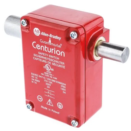 Centurion Timed Delay Bolt. Designed to provide a time delay after machine switch off prior to the guard being able to be opened When the thumb wheel is manually rotated the interlock shaft is withdrawn, isolating the positive break safety contacts, removing the power to machinery Only when completely withdrawn can equipment be accessed, typically taking 15-20 seconds 2N/C 1 N/O contacts, make-before-break IP66 ingress protection Simple operation ; installation Conforms to EN 1088, EN 292, EN 60947-5-1, EN 60204-1