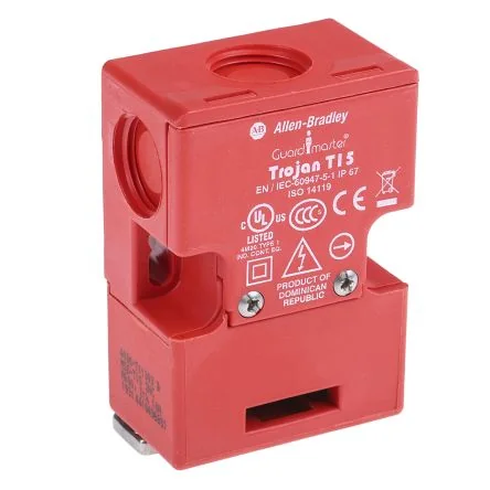 Allen Bradley Guardmaster 440K-T11303 Trojan T15 Safety Interlock SwitchThe 440K-T11303 Trojan T15 Safety Interlock Switch offers essential reliability, ease-of-use, and greater durability for your machine guard door to keep your processes running as smoothly and safely as possible.This compact unit is a universal tongue actuated safety interlock switch which features 2 entry slots. The head can be conveniently rotated to offer up to 4 actuator entry options, allowing application flexibility to suit your requirements. The head can be moved only by releasing the cover screws. The Trojan T15 safety switches are designed to be fixed onto hinged, sliding and lift-off machine guards and offer superior protection for equipment and operators.The 440K-T11303 standard model Trojan T15 tongue interlock switch has 2NC (Normally Closed) safety contacts. The housing material is red for high visibility and is comprised of resilient UL approved glass filled polybutylene terephthalate. It is water-tight and dust-proof, giving it a high ingress protection rating of IP67. This safety switch also has a standard type actuator made of robust stainless steel for high durability. It has M20 conduit entry and a voltage rating of 600VAC and 600VDC. Operation of the interlock unit is simple – the specially profiled key must be permanently fixed to the guard door and can then be inserted into the switch.Features and Benefits:• Direct opening action contacts and tamper-resistant mechanism • Dual key entry slots and rotatable head to allow up to 4 actuator entry points • 30N actuator retention force for improved stability and security • Compact size, offering greater versatility - 75 x 52 x 32mm • 3 M20 conduit entries • Easy installation • Durable and reliable due to high IP67 environmental protection rating Note: Units are supplied with a standard actuator, other actuators may be ordered separately. This device can be used with GuardLink, a new linking technology from Allen Bradley Guardmaster. GuardLink simplifies and reduces the connection time of the safety system while providing real-time diagnostic information over Ethernet IP. This simplifies the identification of the location of the device that has tripped the system. Thus, it reduces downtime and improves the overall efficiency of the machines. For more details, please refer to the GuardLink brochure.Certifications:EN 954-1 ISO 13849-1 IEC/EN 60204-1 NFPA 79 EN 1088 ISO 14119 IEC/EN 60947-5-1 ANSI B11.19 AS 4024.1 cULus approved TÜV certified CCC certified IP67 rated (Enclosure)How does a Safety Interlock Switch work?Safety interlock switches work by securely locking guard doors and gates, preventing unsafe access to hazardous areas where machinery may be in operation. This helps to decrease the risk of injury to personnel and damage to equipment. They can also be used to monitor the status of the guard, and to ensure that machinery cannot start up or run while the guard door is open. They are often utilised in industrial applications, such as safeguarding factory production lines. They can vary in lock type, maximum current and voltage, and housing material. These interlock switches are specifically designed to meet high standards of protection. Rockwell Automation is a global leader in industrial automation and digital transformation, and brings smart manufacturing to life. With a long legacy of creating Allen-Bradley® integrated control and information solutions, we help make you as productive as possible. Our portfolio of sensing, safety and motor control products can support your move towards smart machine applications. Allen-Bradley® IO-Link sensors are data-enabled and communicate with all field buses, providing diagnostic and health information about the device before a machine stops, and enabling quick production changeovers through fast parameter downloads from PLCs into the device. This reduces machine downtime and increases manufacturing OEE. For safety components, products with built-in diagnostics simplify the set-up of the smart device, and reduce maintenance, leading to a more efficient, machine data-driven approach.