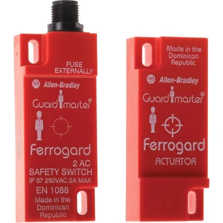 Allen Bradley Guardmaster 440N-G02093 Ferrogard Non-Contact Safety SwitchOptimise your safety system with the 440N-G02093 Ferrogard magnetic non-contact safety interlock switch by Allen Bradley Guardmaster. This magnetically actuated safety switch provides high tolerance to guard door misalignment along with the dependability of contact-free switches. It is perfectly suited for use with hinged, sliding, and lift-off guards and offers superior security and stability.The 440N-G02093 Ferrogard magnetic safety switch has 1NC safety contact, 1NO auxiliary contact, and 250V AC, 2 A max switching capability. The operating distance is 12mm (make), 23mm (break). It has rectangular FRS 2 housing and features a 4-Pin micro quick disconnect connection. The enclosure for this safety switch is made of durable moulded ABS plastic in red to ensure easy visibility of the unit. It is also dust-proof and water-resistant with an ingress protection rating of IP67 (NEMA 6P). Unlike some magnetic switches, the Ferrogard units have protected safety contacts to ensure that they will not fail to danger, offering greater reliability. How it works: The magnetic actuator is removed from the switch when the safety barrier is released. This opens the NC safety contact which then isolates power to the machine. This means that the machinery cannot run while the guard is open and helps to prevent risk of injury to personnel.Features and Benefits:• High tolerance to door misalignment due to large sensing field • Ideal for washdown environments due to IP67 rating • Non-contact actuation, offering long service life due to less wear-and-tear • High switching current • Internal non-resettable overload protection on the safety contactCertifications:EN954-1 IP67 rated ISO13849-1 IEC/EN60204-1 NFPA79 EN1088 ISO14119 ANSI B11.19 AS4024.1 CE certified UL listedRockwell Automation is a global leader in industrial automation and digital transformation, and brings smart manufacturing to life. With a long legacy of creating Allen-Bradley® integrated control and information solutions, we help make you as productive as possible. Our portfolio of sensing, safety and motor control products can support your move towards smart machine applications. Allen-Bradley® IO-Link sensors are data-enabled and communicate with all field buses, providing diagnostic and health information about the device before a machine stops, and enabling quick production changeovers through fast parameter downloads from PLCs into the device. This reduces machine downtime and increases manufacturing OEE. For safety components, products with built-in diagnostics simplify the set-up of the smart device, and reduce maintenance, leading to a more efficient, machine data-driven approach.What are the advantages of non-contact safety switches?Non-contact safety switches are highly reliable and durable. They take less wear and tear and are low-maintenance, as well as resistant to shocks and vibrations. They cannot be easily manipulated or tampered with and are ideal for use with machine guard doors to restrict access to unsafe areas. They are often used in industrial environments, such as in factory production lines.