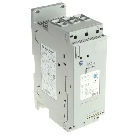 Allen Bradley SMC-3 Controller. The SMC-3 solid-state soft starter by Allen Bradley is low voltage, compact, and cost-effective Smart Motor Controller that features true three phase control, for superior speed control and a smoother, safer motor start-up and stop. The SMC-3 includes overload protection, integral bypass, and motor and system diagnostics to provide you with a flexible electrical motor control solution which reduces downtime and improves productivity. The embedded bypass automatically closes when the motor has reached full speed to minimise heat generation. For fast diagnostics the SMC-3 also features a Hold To Test/Push To Reset button, which detects faults and enables the device to be reset. The LED display provides immediate status indication and assists with troubleshooting. Due to its convenient compact size this device uses less panel space and offers ease-of-installation. DIP switches ensure that set-up is efficient and secure, as they allow setting of the START/STOP profile, built-in overload, connection type, trip class and auxiliary contact characteristics. Integration of the SMC-3 in your electrical motor control system results in less stress/shock to mechanical components due to decreased start-up torque, helping to extend the lifespan of your equipment. It protects against machine damage as line and motor diagnostics detect single-phase conditions. System maintenance is reduced due to lower peak currents during start-up, which lowers operating costs. Allen Bradley offer a range of smart motor starters that will ensure reliable high performance and precision, giving you a long-lasting solution for your application. Features and Benefits:. Quick, easy installation due to simple user interface Includes built-in silicon-controlled rectifier (SCR) bypass/run contactor Provides 3 to 480 A current range to suit your requirements Uses rated voltage: 200…690V AC, 50/60 Hz Includes five start and stop modes Provides embedded programmable electronic motor overload protection (DIP switch selectable - Trip class 10, 15 or 20) Includes a hold-to-test/push-to-reset button to allow fault finding and simple reset, reducing downtime Simplified and secure set-up using DIP switches Programming via Connected Components Workbench™ software Designed for full integration with the Allen-Bradley MCS range. Applications:. Pumps Conveyors Fans Lifts Mixers Chillers. Additional Information: Frame size 1: 45mm wide, 3 phase control facilitating true soft start capability up to 20kW Frame size 2: 72mm wide, 3 phase control facilitating true soft start capability up to 45kW Seven ratings covering 3A to 37A Phase rotation checking Two control voltage ratings: ; 418-6934 418-6934 24Vac/dc and ; 418-6861 418-6861 100V to 240Vac. 50/60Hz over to 0 to 40°C DIP switch-selectable starting methods (soft start 2 to 15 seconds, current limit, kick-start) and stopping methods (soft stop 100%, 200% or 300% of start time, coast to rest). Caution:. kW ratings based on current limit value of 350%. Product should always be selected by Motor Full Load Current