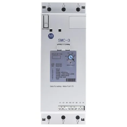 Allen Bradley SMC-3 Controller. The SMC-3 solid-state soft starter by Allen Bradley is low voltage, compact, and cost-effective Smart Motor Controller that features true three phase control, for superior speed control and a smoother, safer motor start-up and stop. The SMC-3 includes overload protection, integral bypass, and motor and system diagnostics to provide you with a flexible electrical motor control solution which reduces downtime and improves productivity. The embedded bypass automatically closes when the motor has reached full speed to minimise heat generation. For fast diagnostics the SMC-3 also features a Hold To Test/Push To Reset button, which detects faults and enables the device to be reset. The LED display provides immediate status indication and assists with troubleshooting. Due to its convenient compact size this device uses less panel space and offers ease-of-installation. DIP switches ensure that set-up is efficient and secure, as they allow setting of the START/STOP profile, built-in overload, connection type, trip class and auxiliary contact characteristics. Integration of the SMC-3 in your electrical motor control system results in less stress/shock to mechanical components due to decreased start-up torque, helping to extend the lifespan of your equipment. It protects against machine damage as line and motor diagnostics detect single-phase conditions. System maintenance is reduced due to lower peak currents during start-up, which lowers operating costs. Allen Bradley offer a range of smart motor starters that will ensure reliable high performance and precision, giving you a long-lasting solution for your application. Features and Benefits:. Quick, easy installation due to simple user interface Includes built-in silicon-controlled rectifier (SCR) bypass/run contactor Provides 3 to 480 A current range to suit your requirements Uses rated voltage: 200…690V AC, 50/60 Hz Includes five start and stop modes Provides embedded programmable electronic motor overload protection (DIP switch selectable - Trip class 10, 15 or 20) Includes a hold-to-test/push-to-reset button to allow fault finding and simple reset, reducing downtime Simplified and secure set-up using DIP switches Programming via Connected Components Workbench™ software Designed for full integration with the Allen-Bradley MCS range. Applications:. Pumps Conveyors Fans Lifts Mixers Chillers. Additional Information: Frame size 1: 45mm wide, 3 phase control facilitating true soft start capability up to 20kW Frame size 2: 72mm wide, 3 phase control facilitating true soft start capability up to 45kW Seven ratings covering 3A to 37A Phase rotation checking Two control voltage ratings: ; 418-6934 418-6934 24Vac/dc and ; 418-6861 418-6861 100V to 240Vac. 50/60Hz over to 0 to 40°C DIP switch-selectable starting methods (soft start 2 to 15 seconds, current limit, kick-start) and stopping methods (soft stop 100%, 200% or 300% of start time, coast to rest). Caution:. kW ratings based on current limit value of 350%. Product should always be selected by Motor Full Load Current