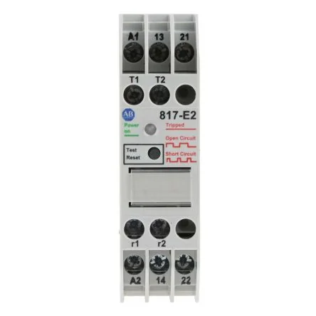 CE, cULus Listed. Allen-Bradley 817-E Range. Thermistor Protection Relays offer protective functions that are easily added and applied to motor control circuits. Typical applications include VFD Controlled Motors, Transformers, Bearings and Compressors. Monitors over temperature Connection of up to six PTC thermistors in series Open and short circuit detection Short circuit protected signal input Status indication LED ‘s No settings necessary Compact 22.5mm DIN rail mount housing Two versions available: Type E1, temperature protection, automatic reset. Type E2, temperature protection, status storage, auto, manual and remote reset options