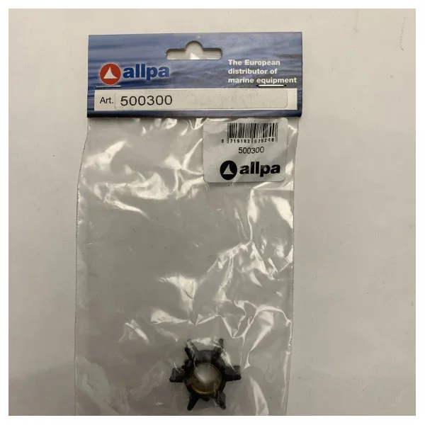The Allpa 500300 is a high-quality water pump impeller suitable for marine applications. This impeller has six blades and is made from durable plastic with a metal inner ring, ensuring a reliable connection to the shaft and a long lifespan. The compact design makes it easy to install and replace the impeller in various engines and pump systems. This product is ideal for maintaining optimal water circulation and cooling, essential for preventing overheating in ship engines. The Allpa 500300 is known for its robust quality and effective performance in marine environments.