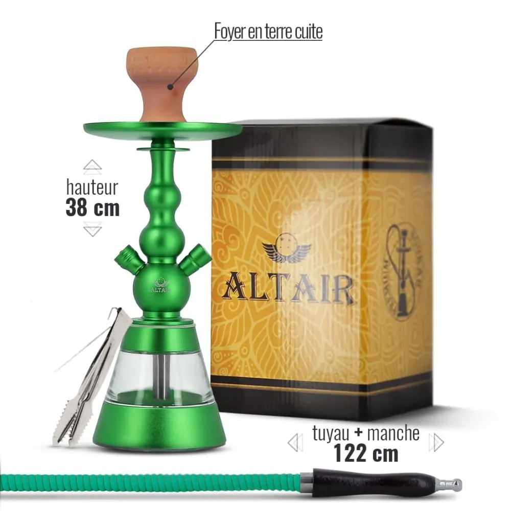 altair khephren hookah 38 cm high.. this shisha offers you a very modern design with a very pretty finish.. this one will be delivered to you with a bowl a charcoal tongs and a hose with matching handle.. green and transparent..