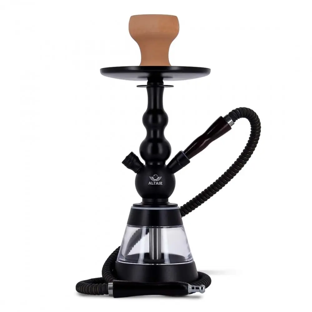 altair khephren hookah 38 cm high.. this shisha offers a very modern design with a very pretty finish.. this one will be delivered to you with a hearth a charcoal tongs and a pipe with matching handle.. black and transparent..